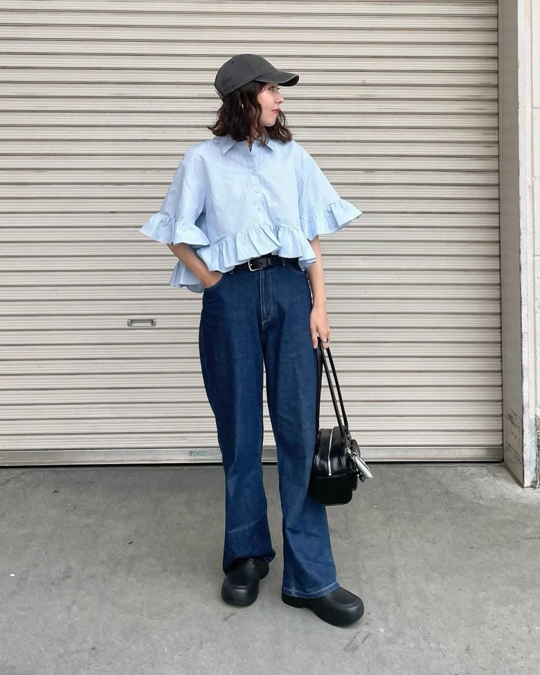 こちらは、爽やかな色合いの「ペプラムシャツ」。袖口と裾にあしらわれたボリューミーなラッフルとさりげなく入ったストライプ柄のバランス感が絶妙におしゃれ。ふんわりとボリュームをもたせたデザインで、シルエットもかわいい♡そんなブラウスにデニムを合わせた大人カジュアルコーデは、春のお出かけにぴったりなスタイルです。@goppiiiyさんは足元にもrokhコラボの「ローファークロッグサンダル」を合わせて、トレンド感満載のコーデに♪