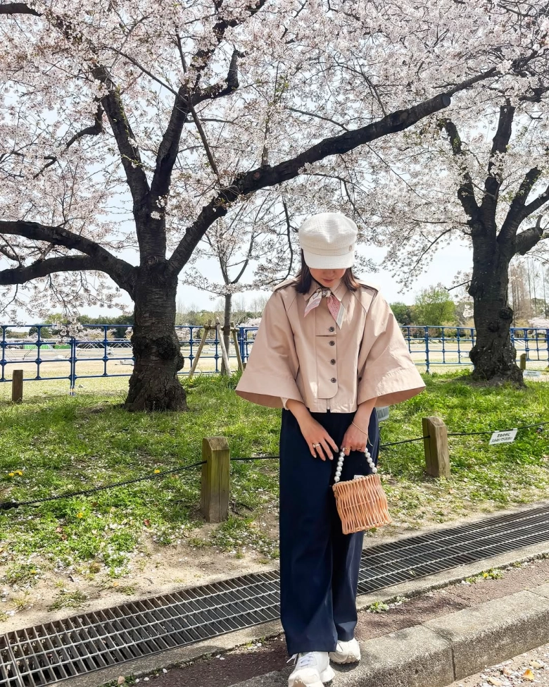 こちらはクラシカルなベージュの色合いが愛らしい「ショートケープコート」。袖口のボタンを外すと、ケープスタイルにチェンジできるのも魅力です。@rn_style.iさんは、コーデのアクセントに首元にツイリーを合わせました♡春夏らしい爽やかなファッションで、マネしたい!