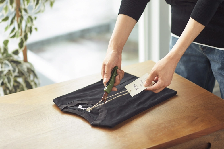 アウトドアツールのような3色で展開。カーキとオレンジは、サンドベージュのスタンダードな刃に、チタンコートを施し硬度を高めた設計になっているんです。そのためお値段が少しアップしますが、切れ味がよく長持ちするそうですよ。ストラップホールもついているので吊るして収納でき、必要な時にパッと使えるのもいいですよね!