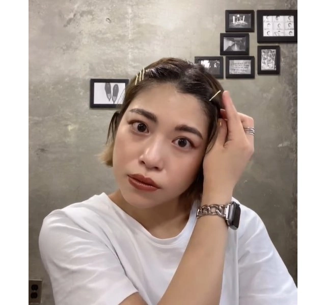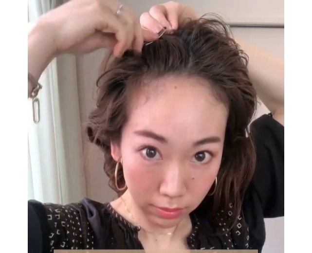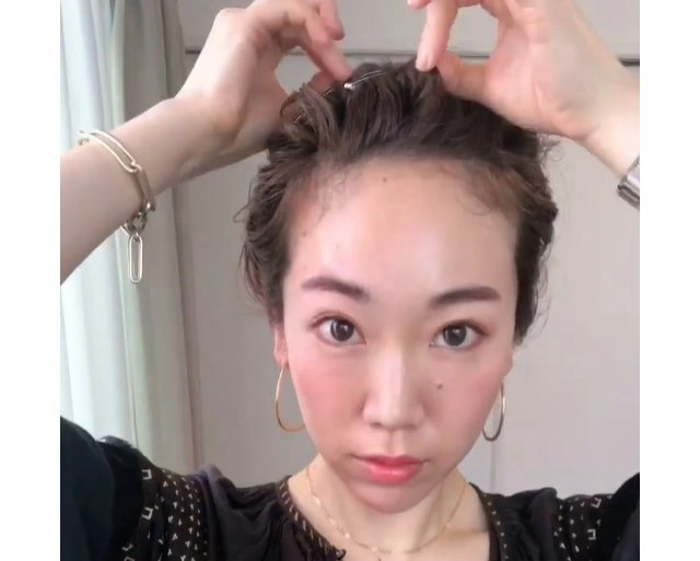 - かきあげた前髪をパッチンピンでランダムにとめる