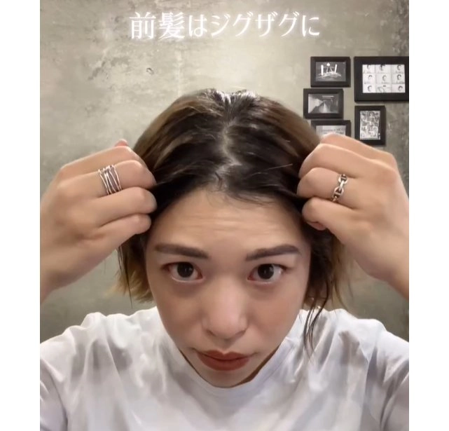 前髪を真ん中で分けましょう。このとき、指でジグザグに分け目を作ると、よりおしゃれに見えますよ。