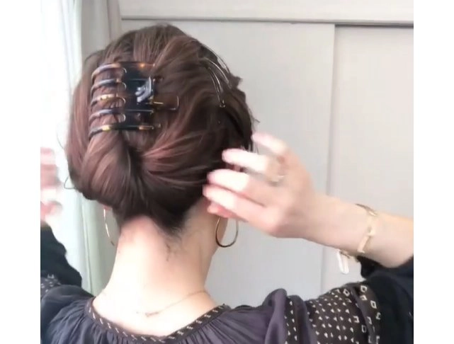 後ろへ流した前髪といっしょに後ろ髪もヘアクリップでまとめてねじり上げ、すっきりさせましょう。