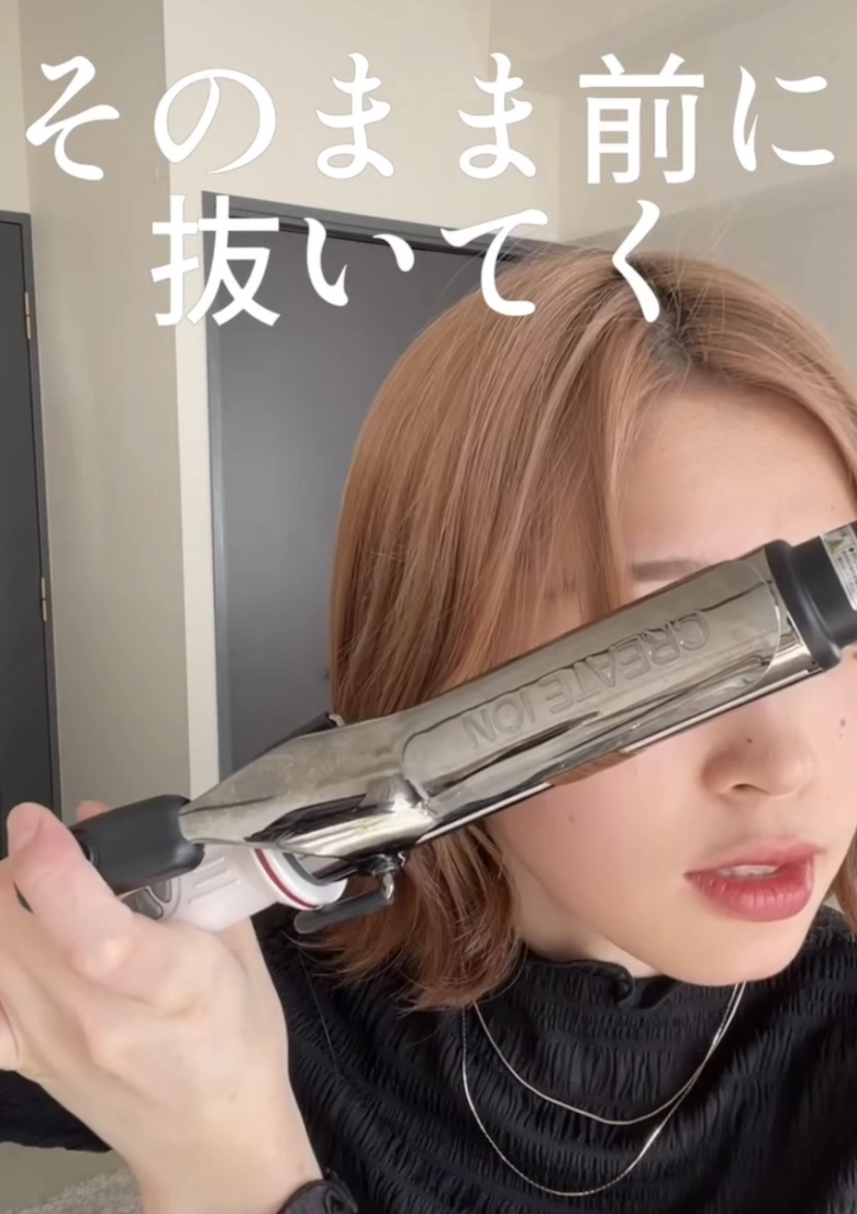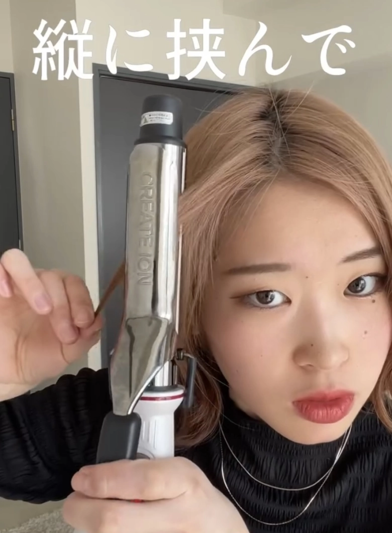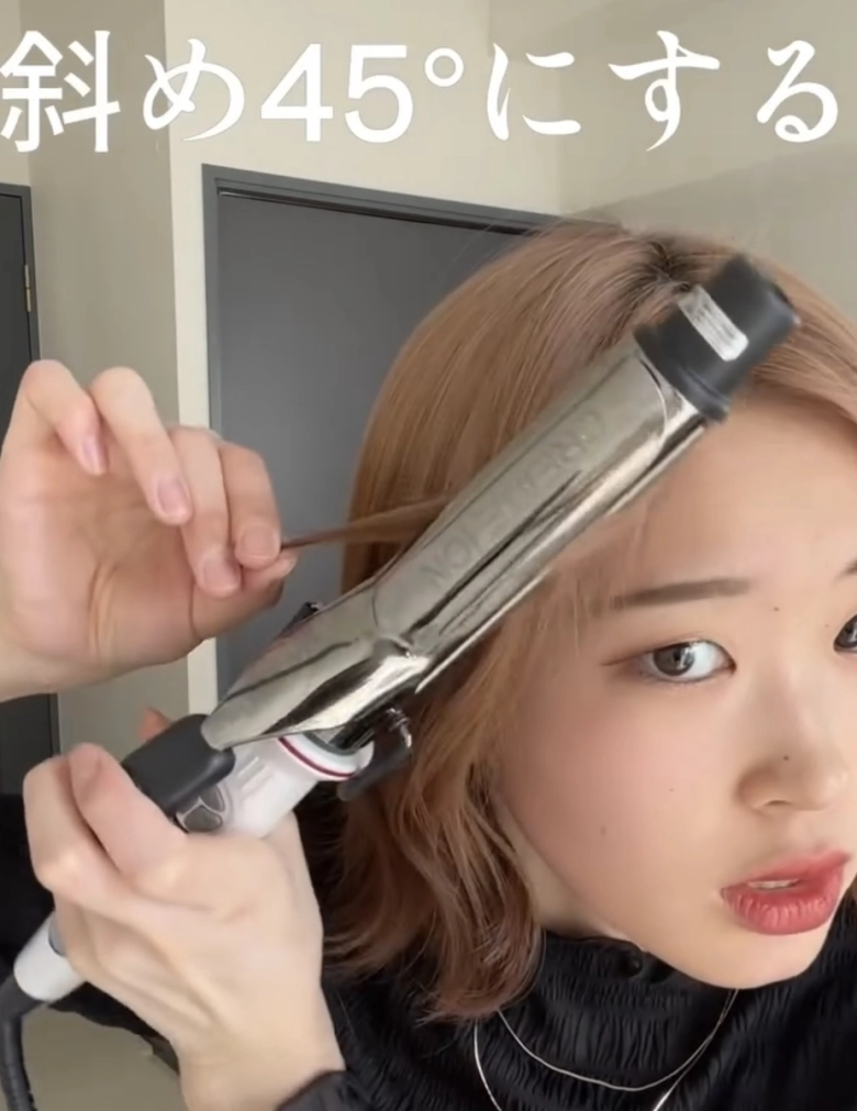 - 縦にしたコテで前髪を挟み、斜め45°にしてスライドする