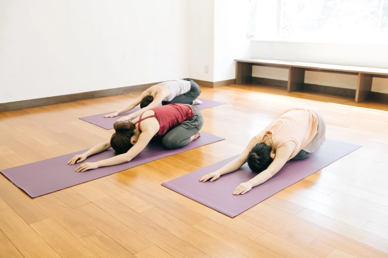 - おしりを下げてかかとにつけ、おでこを床に近づけて30秒キープ