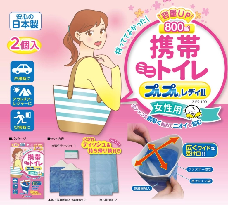 『ケンユー』の「プルプルレディⅡ」は、女性向けのコンパクトサイズ2回分の携帯トイレです。見た目に配慮されたピンクのパッケージで、水溶性ティッシュと持ち帰り袋つき。女性が使いやすいよう受け口が広くなっていて、本体は中身が透けにくい色です。800mlまで吸収可能。尿をすばやく固めてニオイを包み、ファスナーで密閉すれば漏れの心配もありません。使用後の中身は、水を加えてトイレに流せます。「受け口が広いし、一瞬で固まった。吸水量も多いので安心」といった口コミが見られました。