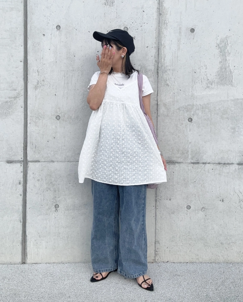 @aiii__13kさんはカジュアルなTシャツ&ジーンズスタイルに、しまむらの小花柄レースキャミをプラス!透け感があるのでレイヤードしても暑苦しさがなく、女性らしいさわやかなコーデに仕上がっています。夏のコーデがマンネリ化している方はぜひ取り入れたい1枚ですね。