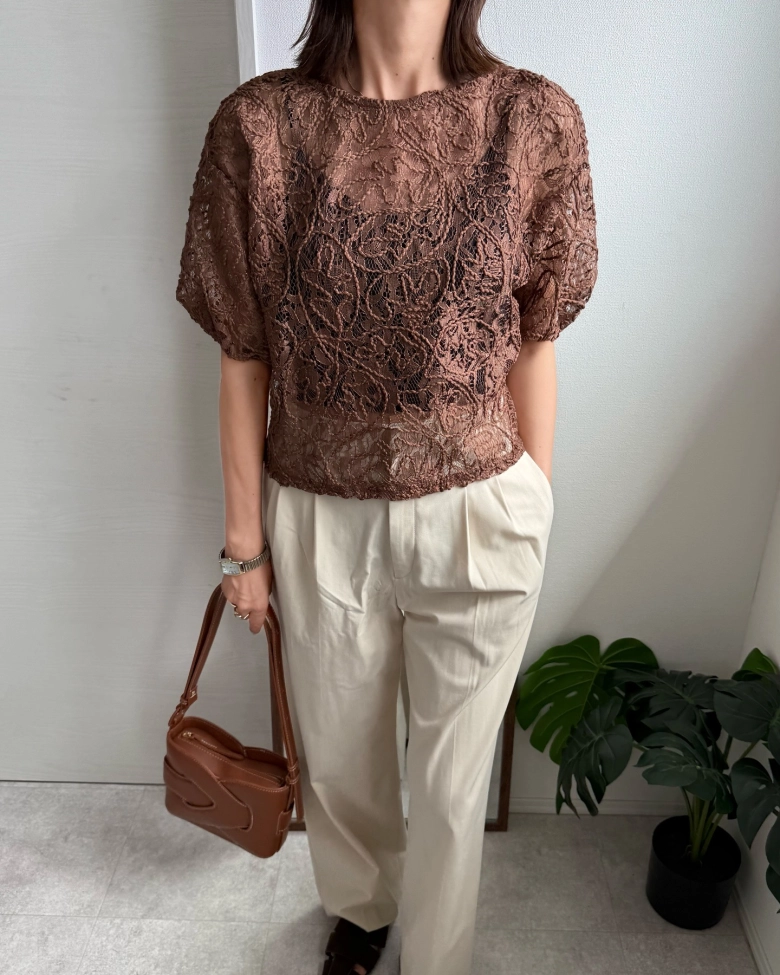 こちらは、上品な印象を与えてくれるブラウンの刺繍レーストップス。肌が見えすぎないほどよい透け感で、シアーアイテム初心者でもチャレンジしやすいアイテムです。袖口にはゴムが入っているため、美しいポワンとしたシルエットになります。ブラウンはさまざまな色と相性のいいカラーですが、@h_n_l_28さんはアイボリーのボトムスをチョイス。どちらも肌なじみのいい色なので、穏やかな雰囲気のコーデに仕上がっていますね。
