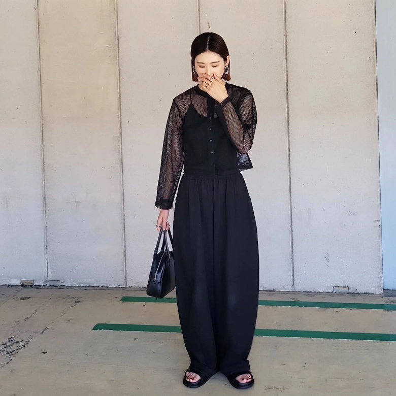 全身ブラックコーデはメッシュカーデで抜け感と涼しさをプラス♪