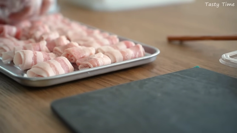 上の写真のように、一枚ずつクルクル巻いて冷凍保存すると、空洞ができるので凍ったままでも包丁で簡単にカットできるようになるんだとか。作業が終わったら、巻いた豚肉を金属製のバットに乗せて冷凍庫へ入れます。2時間ほどで半冷凍状態になるので、そのままチャックつきの保存袋に入れて冷凍庫へ戻しましょう。この方法で冷凍しておけば、少量ずつ使えてかつ調理するときに火の通りが早くなります♪