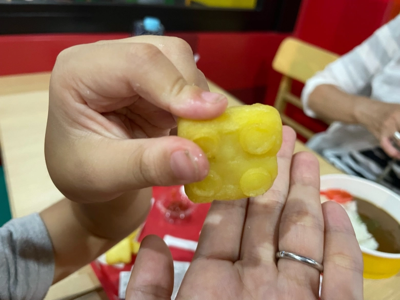 今回子どもたちにはカレーのセットを注文しました。甘口カレーで小さい子も食べやすく、セットのおもちゃにはレゴが付いてきます。おもちゃは3種類の中から選べるようになっていて、お花などの女の子が好きそうなものから、バトルをイメージした男の子向けの物などがそろっていました。ポテトもレゴブロック型でかわいいのでテンションが上がります!
