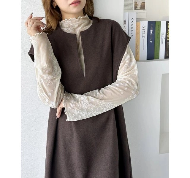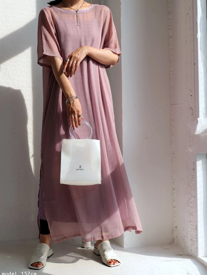 たとえば『antiqua(アンティカ)』の「2WAYシアーワンピ」は、ストンと落ちるシルエットが上品な印象で、40代にもぴったり。付属のインナーワンピースとセットで着るのはもちろん、シアーワンピース単体でさまざまなアイテムとのレイヤードを楽しむこともできます。
