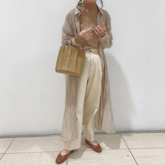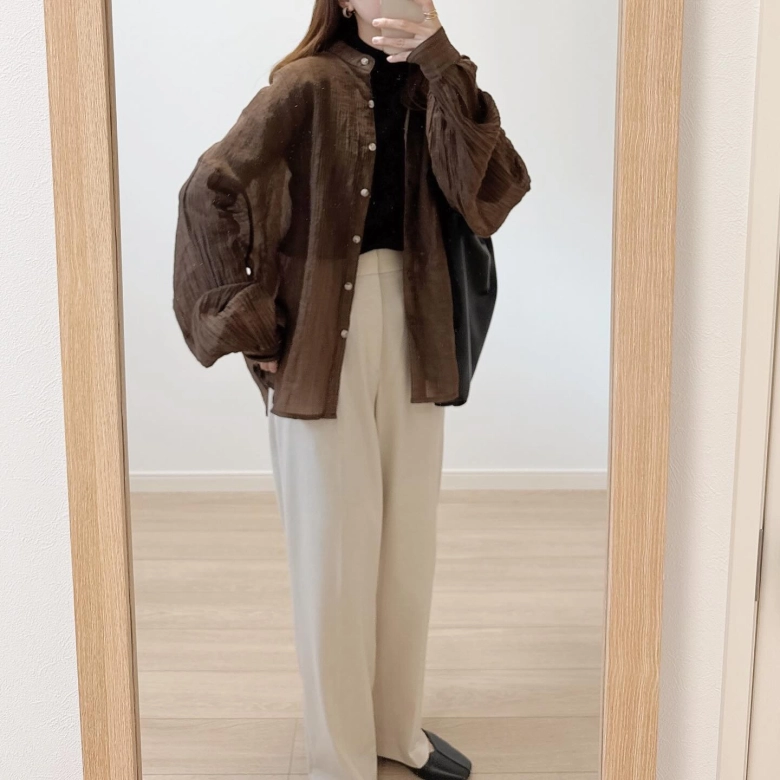 近年はまだまだ暑さが厳しい日もある秋。落ち着いた色を取り入れることで、快適さはそのままに、秋らしい雰囲気を演出しましょう。ここからは、40代も着やすい、秋のシースルーシャツ・シアーシャツコーデを紹介します。