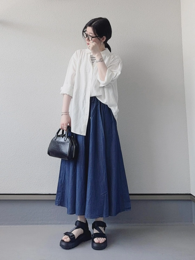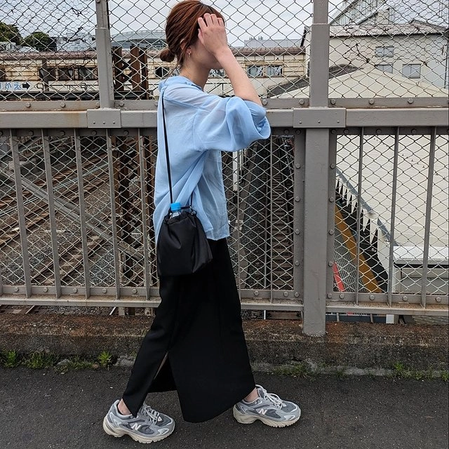 @sachona.gramさんは、ホワイトのタンクトップにライトブルーのシースルーシャツを羽織っています。暑い夏でも、涼し気なカラーや素材を取り入れることでさわやかさを演出!ボトムスはハリ感のある黒のタイトスカートを合わせており、メリハリのあるコーデに仕上がっています。