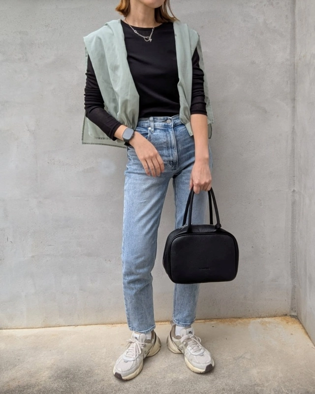朝や夜は少し肌寒くても、昼間はぽかぽかと暖かい日が多い春。日中はシースルーシャツを肩掛けにすれば、おしゃれと温度調整の両方が叶います♪ミントカラーのシースルーシャツにライトブルーデニム、白スニーカーと春らしい色でまとまっていますが、@sachona.gramさんはバッグやインナーを黒にすることでコーデを引き締めています。