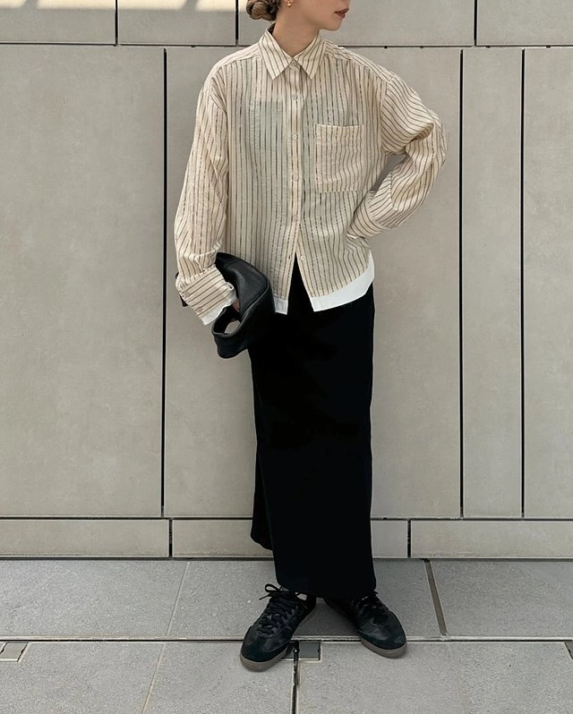 @2323sonさんは、ベージュのストライプ柄シースルーシャツをチョイス。透け感も強くないので、メンズライク好きな40代の秋コーデにぴったりのアイテムですね。縦長のラインが強調されるストライプ柄シャツとタイトスカートの組み合わせは、スタイルアップ効果も期待できます。
