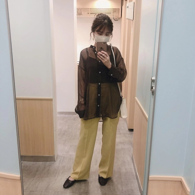 トレンドのバターイエローのパンツを使った@katsubuuさんのコーデ。シースルーシャツをダークカラーにすると、秋らしさとメリハリが出ておしゃれ度がグッとアップします。主張の強いイエローのパンツにはシースルーシャツをインせず、暗めカラーの割合を増やすことで、大人のかっこよさを演出できます。