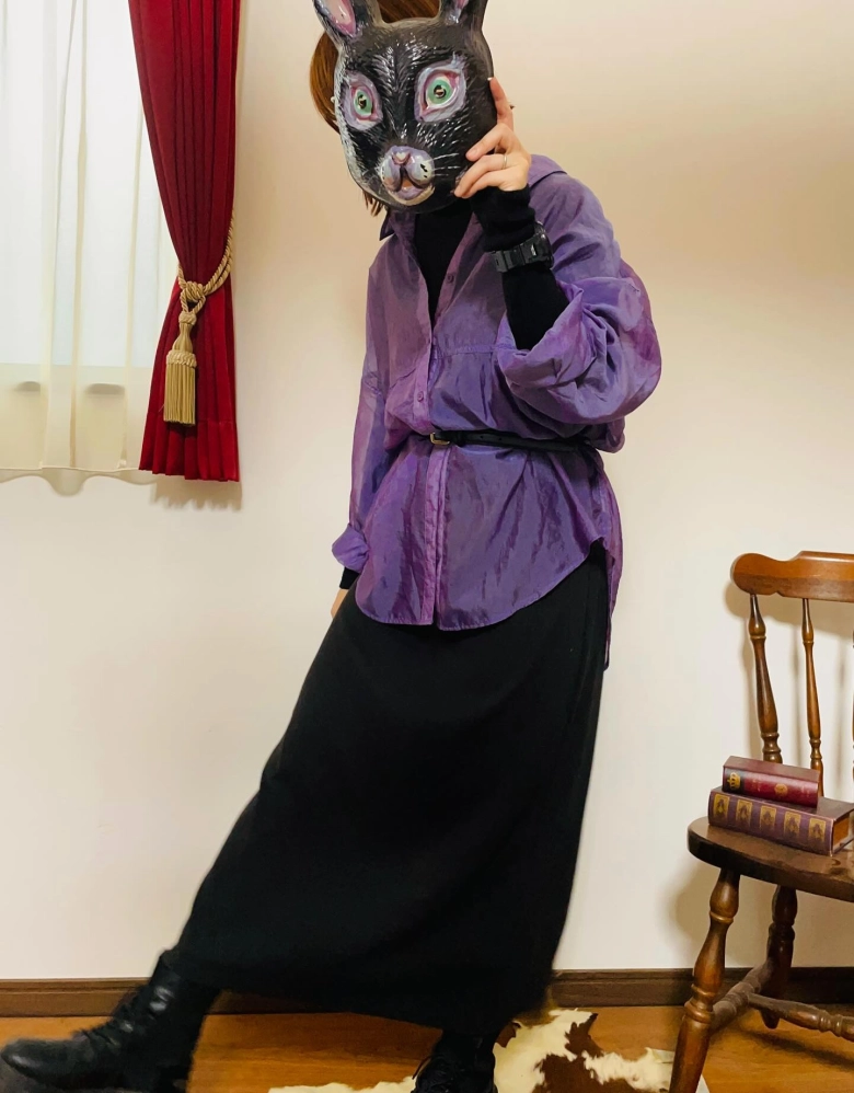 こちらは、@bisco.disco_74さんのワンピース+シースルーシャツコーデ。タートルネックの黒のワンピースに光沢のあるパープルのシースルーシャツを重ねています。シャツの上からベルトでウエストマークすることでコーデにメリハリが生まれ、脚長効果も抜群です。ワンピースやブーツ、小物を黒で統一したことで、シースルーシャツの存在がより際立っていますね。