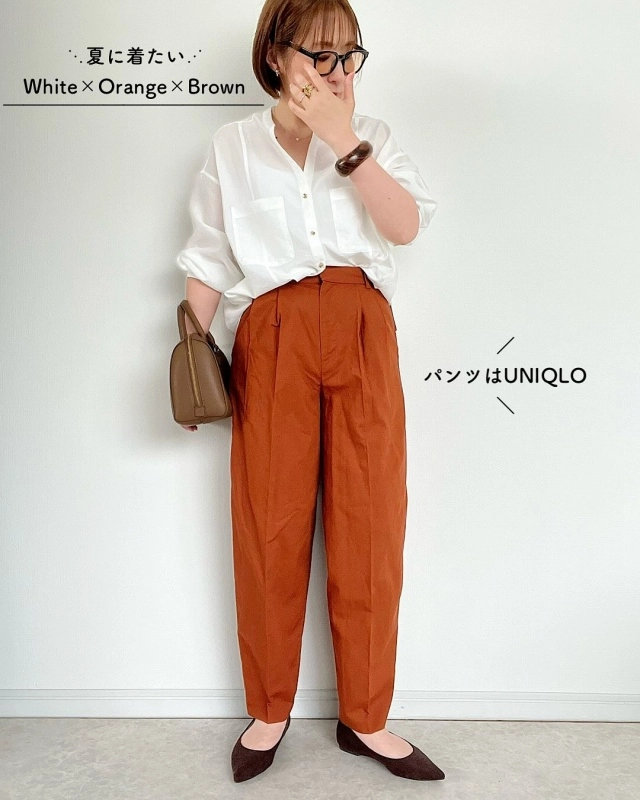 @maiko_wearさんのコーデの主役は、着るだけで元気になるオレンジのパンツ♪シースルーシャツ初挑戦という40代さんは、派手めなカラーをボトムスに取り入れるのもおすすめです。視線が下に集中するため、シャツのフェミニンな印象を抑えられるでしょう。ホワイトのシースルーシャツは顔色を明るく見せてくれるので、大人の女性にもぴったりのアイテム!アイテムはシンプルですが、シャツの透け感とボトムスのカラーによって、夏らしさと今っぽさが増しているコーデですね。