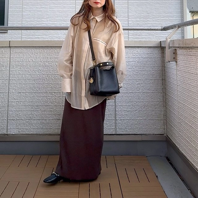 ベージュのシースルーシャツに濃いブラウンのペンシルスカートを組み合わせた、@spthanx777さんのコーデ。お尻まですっぽりと隠してくれるオーバーサイズのシャツにタイトなスカートを合わせ、シルエットのバランスをうまく取っていますね。冬の終わりなどの季節の代わり目にぴったりなコーデですが、インナーをハイネックなどに変えることで真冬にも対応できるでしょう。