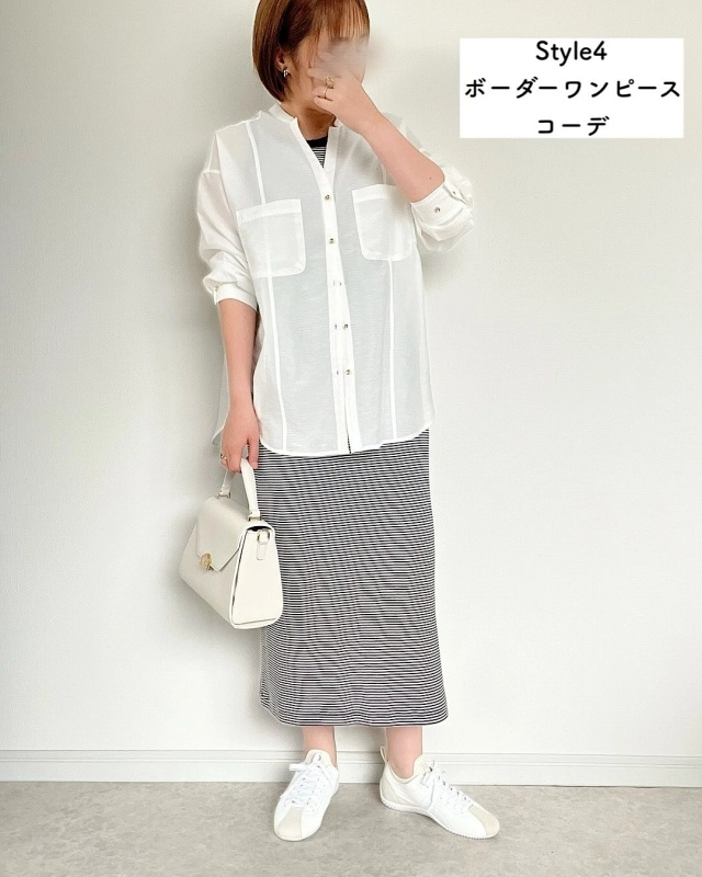 きれいめデザインのシースルーシャツは、カジュアルなアイテムと合わせると普段づかいしやすくなりますよ。こちらは、ホワイトのシースルーシャツにボーダーワンピースを合わせた@maiko_wearさんのコーデ。大人の女性がボーダーを着るなら、比較的上品な印象を与える細めがおすすめです。白いシースルーシャツと相まって品のいい大人カジュアルコーデに。ワンピースはノースリーブですが、カップつきなのでブラジャーのひもが透けて見える心配もありません。