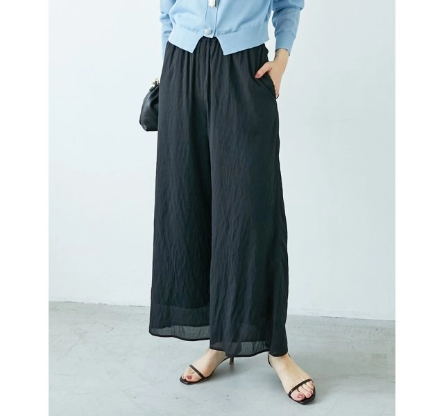 『le.coeur blanc(ルクールブラン)』の「リネンライクシアーボイルイージーパンツ」は、リネンのようなほどよい透け感の生地を採用。ワイドシルエットなので脚に貼りつきにくく、締めつけもないので夏でも快適に過ごせます。裏地が長めなので、シアーパンツ初心者さんでも挑戦しやすいでしょう。