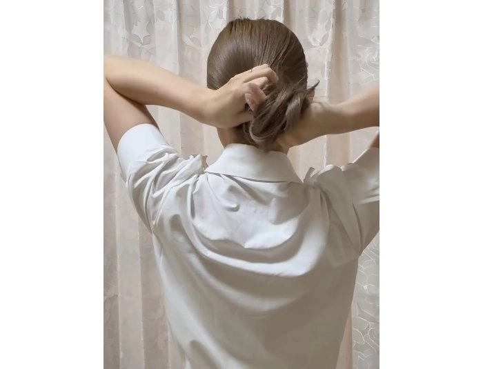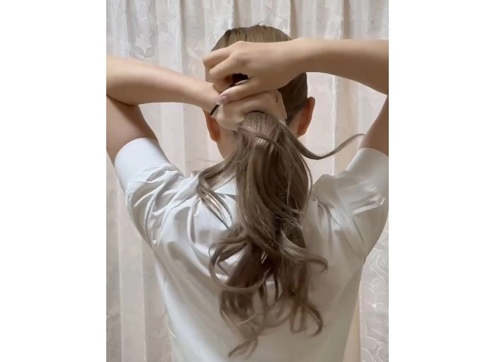 耳下あたりの位置で全体の髪の毛を一つにまとめます。