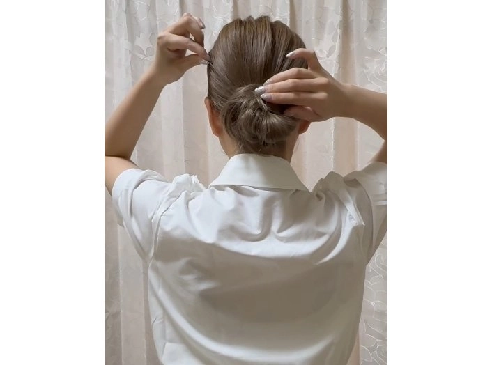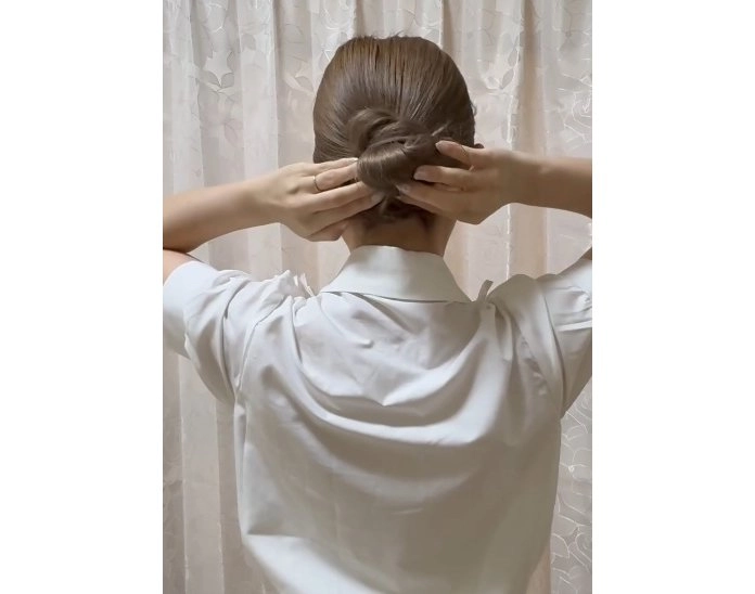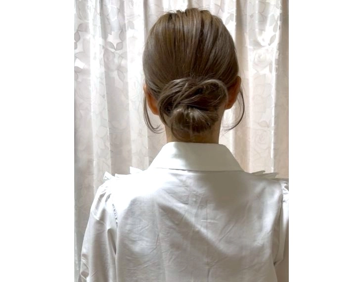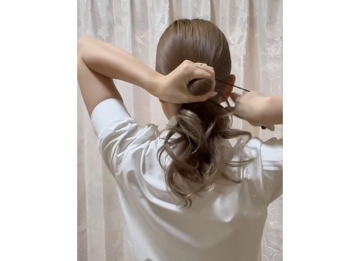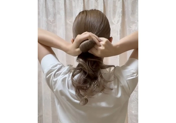 ゴムごと毛束をひねったら、そのまま丸めて2で作った輪っかの上にかぶせます