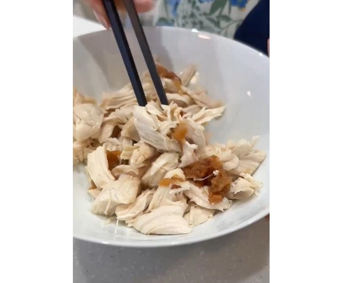 2で加熱したささみを別皿にあけ、細かく裂いていきます。