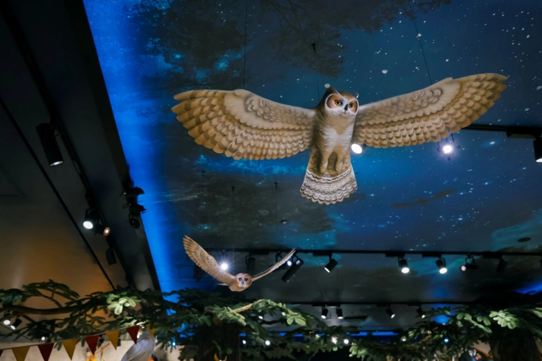店舗総面積は約900平方メートル、2フロア構成になっていて、作中でも登場する「禁じられた森」をテーマにした内装は、誰もが映画の世界へと没入できる空間です。魔法動物のバックビークやフクロウたちがお出迎えしてくれるのも、ハリポタファンにはたまりません!