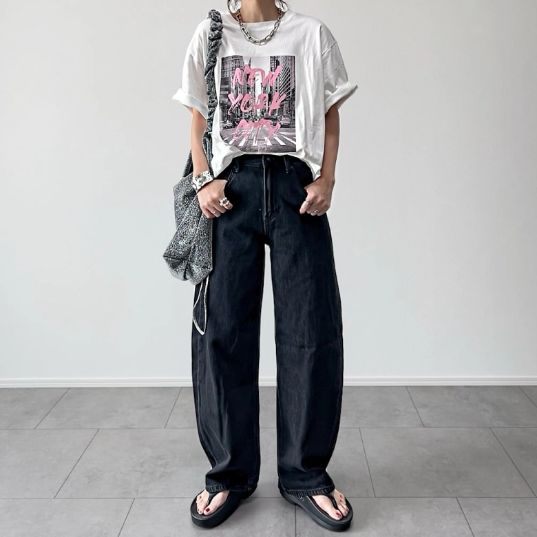 ダークグレーのバギーカーブジーンズにTシャツ、サンダルを合わせた@maayuutaさんのコーディネート。組み合わせはシンプルですが、デニムはカーブシルエット、Tシャツはフォトプリント、サンダルは厚底と、2025年のトレンドをしっかりと取り入れています。さらに、チェーンネックレスやリング、バングル、グリッターバッグと、小物類はバギーカーブジーンズのダークグレーにぴったりなシルバーで統一。クールな大人のカジュアルコーデに仕上がっていますね