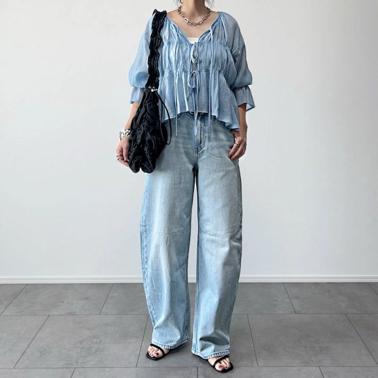 ライトブルーのデニムはシアー素材と合わせて軽やかな着こなしに