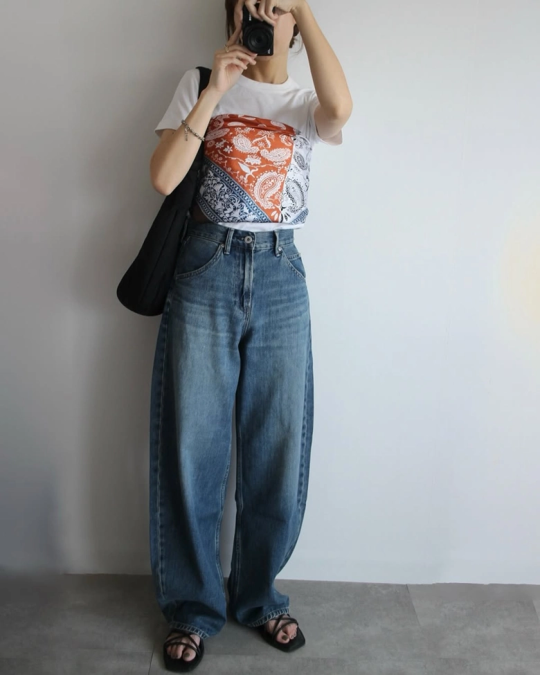 履き込んだような風合いが魅力のブルーのバギーカーブジーンズは、シンプルな白Tシャツと合わせるだけでもこなれ感を演出できます。@a.__yaさんは、ペイズリー柄のスカーフをビスチェのように巻いて、シンプルなコーディネートに遊び心をプラス。ビンテージブルーのバギーカーブジーンズなら、定番のアメカジからきれいめスタイルまで、幅広い着こなしが楽しめますよ。