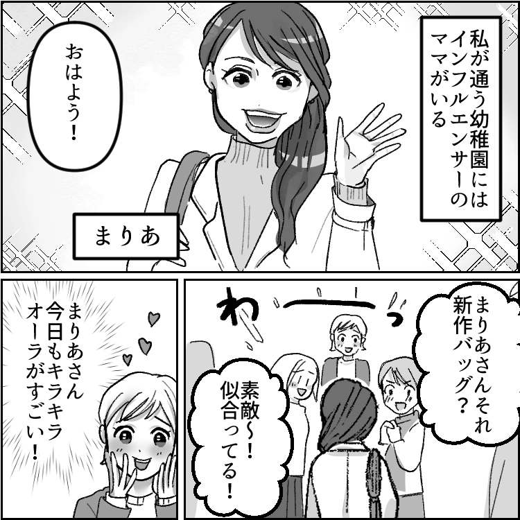 主人公・優子と同じ幼稚園に通うまりあさんは、人気急上昇中のママインフルエンサーだ。ご主人が多忙なため、いつもワンオペで男の子2人を育てているにもかかわらず、毎日オシャレもメイクも完璧で、インスタには日々素敵な料理を投稿しているまりあさん。そんなキラキラした彼女に、園ママたちは憧れていた。そんなある日、まりあさんの自宅でホームパーティーが開かれることに。彼女の華やかなおもてなし料理で、楽しくパーティーを過ごすママたち。しかしその日の夜、なんとまりあさんが男性を連れ込んでいる場面を見られてしまう!?