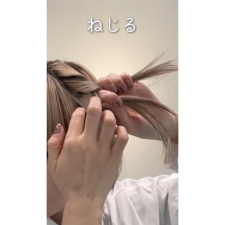 2つの毛束を両手で持ち、下の毛束が上になるように後ろへねじります。その内側の髪を少し取り、下側にきた毛束と合わせてさらにねじっていきましょう。これを繰り返します。
