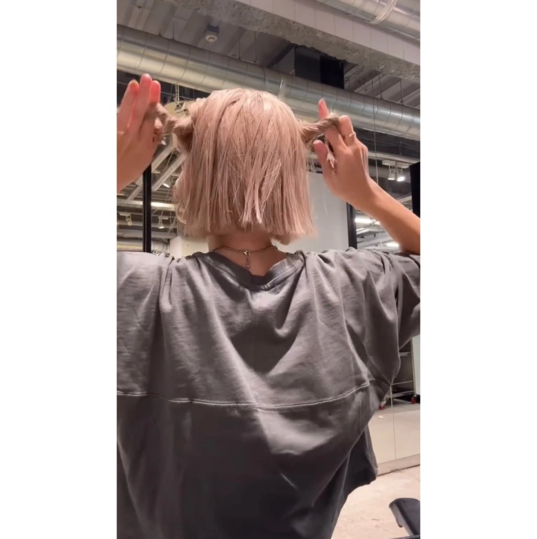 髪にスタイリング剤をなじませ、耳上の髪を左右ふたつに分けます。まっすぐではなくあえて斜めに分けると、よりおしゃれに仕上がりますよ。