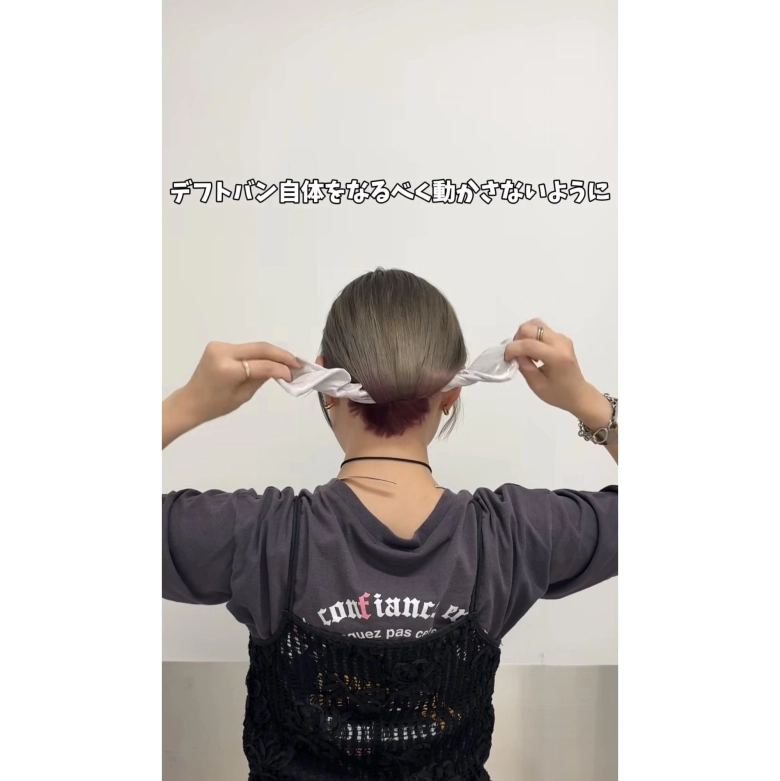 なるべく頭に近い位置にデフトバンをセット。デフトバンの両側を持ち、できるだけ根元に近い位置で外に向かってまず3~4回くるくると巻きましょう。1~2回だけ巻いて下にずらしてしまうと、デフトバンの穴が埋まりきらずお団子がくずれてしまうので要注意です。