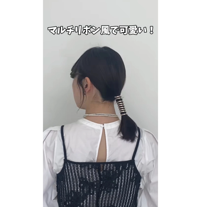幼く見えがちなツインハーフアップも、後ろのほうで結ぶことで大人ガーリーな雰囲気に。簡単かつ崩れにくいので、レジャーや公園遊びなどでたくさん動く日にもおすすめです。