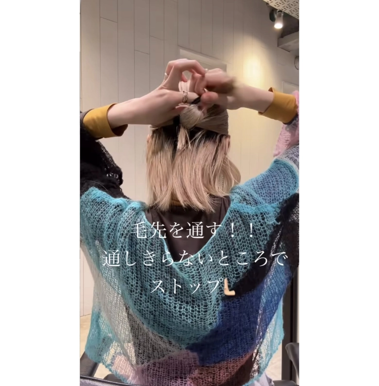 ヘアゴムを少し下げて髪の中央に穴をあけ、毛先を上から入れましょう。