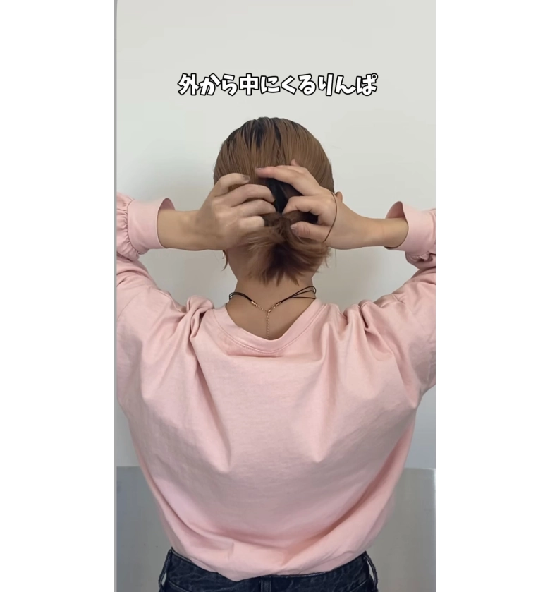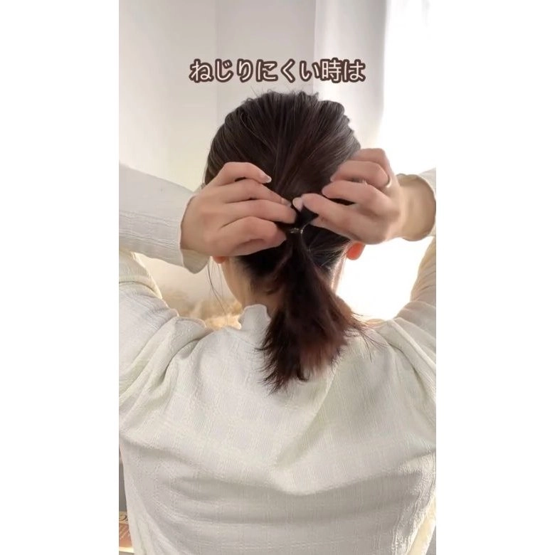 合わせた毛束をくるりんぱしたら、毛先をぎゅっと引き締めて完成です。