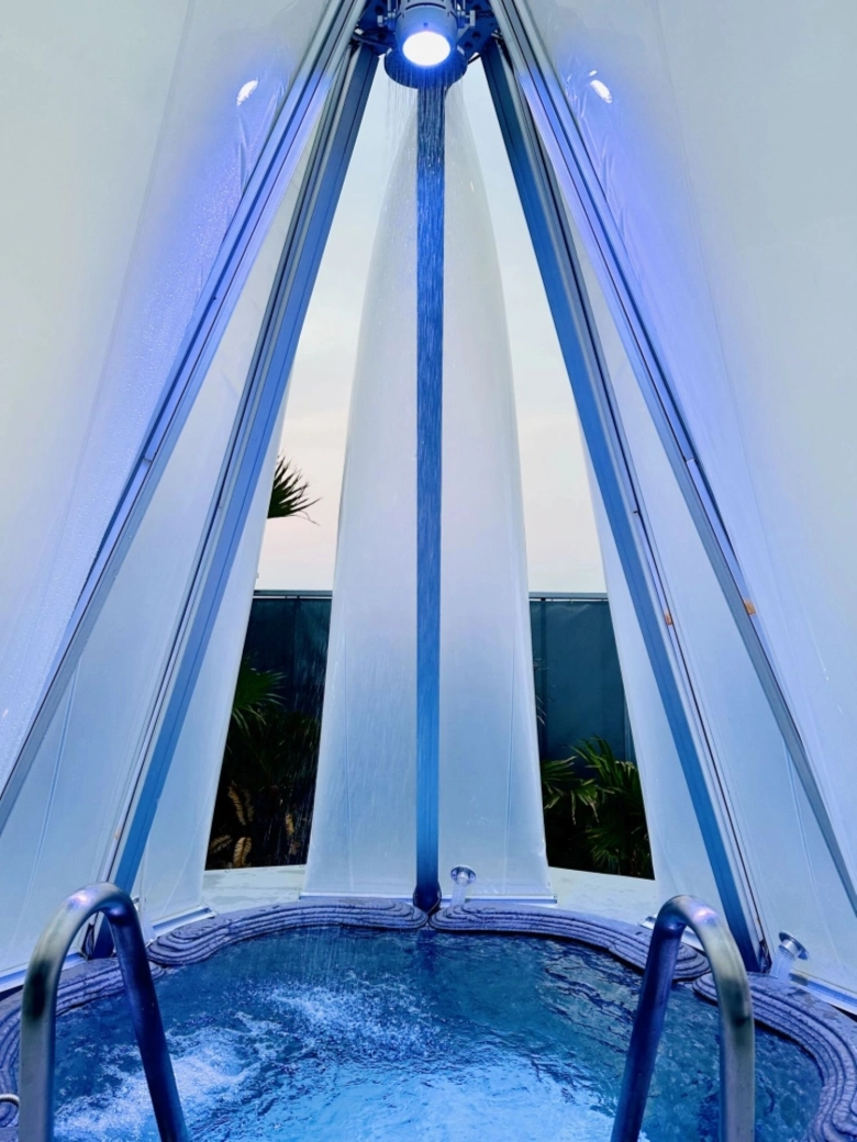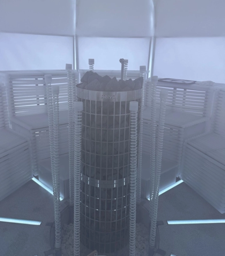 サウナですが中央にはHARVIA製のサウナが鎮座しています。テント膜でのサウナなのでそこまで温度は上がらないと踏んでいましたが、いざ入ってみると100度近くまでいく激アツなサウナです。サウナリチュアルが普通のサウナと違うのはガイドの方がナビゲーションしてくれるところ。時間やその時の感覚に合わせて、音を奏でたり、サバンナの雨を降らせたり…と、これ以上はネタバレになってしまうのでこのあたりでストップしますが。