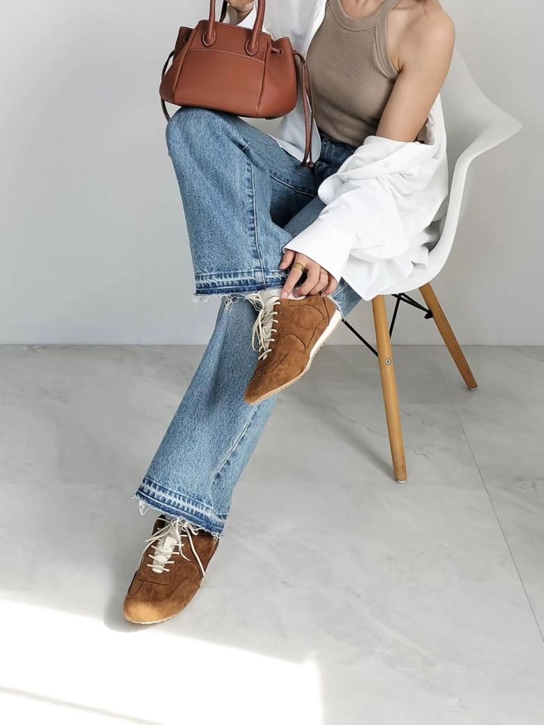 @my_favorite_miさんは、デニムにダブルシューレースフラットスニーカーをプラス。同じくブラウンのバッグとの相乗効果で、カジュアルすぎない大人のデニムコーデが完成!高見えする素材感が、コーデをぐっと格上げしてくれていますね。