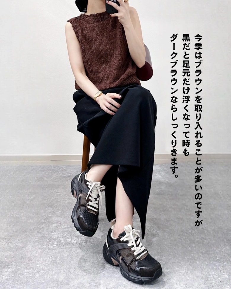 ダークブラウンなら、きれいめコーデにあわせてもしっくりきます。@caho146cmさんは、スカートの足元からスニーカーをのぞかせてこなれ感アップ。ありそうでなかったアイボリー×ダークブラウンの配色で、おしゃれ度もマシマシです!