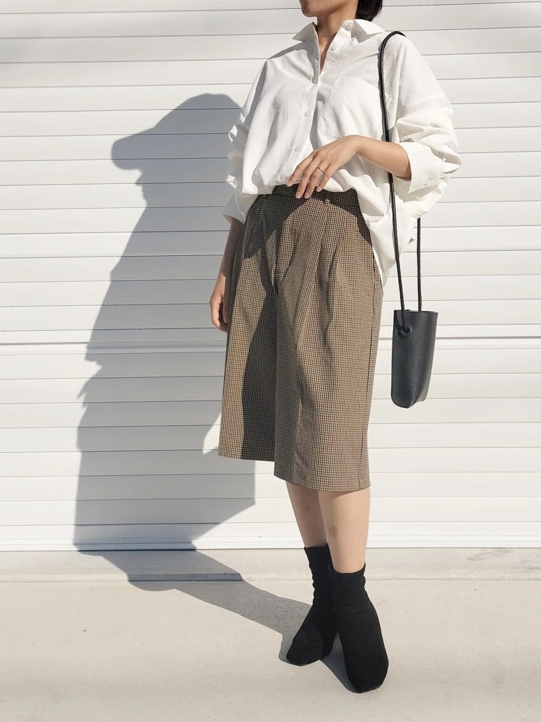 同じくGUの「バミューダチェックショートパンツ」を合わせると、一気に秋らしい雰囲気になります。シャツとパンツのコーディネートは硬い印象になりがち。しかし、ドルマンスリーブシャツは表面にカジュアルな風合いの加工が施されているので、きれいめなパンツと合わせても抜け感のあるおしゃれな印象にまとまりますよ♡@chanchanochaさんはショートブーツやバッグを黒でまとめ、膨張して見えがちな淡色コーデを引き締めています。