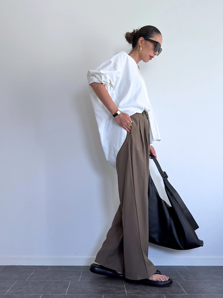 最初にご紹介するのは、オフホワイトのドルマンスリーブシャツにブラウンのパンツを合わせたカジュアルコーデ。あえてXLと少しオーバーなサイズを選ぶことで、海外っぽさのあるラフな雰囲気を演出できます。体のラインを拾いにくいシルエットで、気になる二の腕や腰、お尻周りを隠すのにもぴったり!@mhi_7746さんのようにシャツの裾は片方だけをインすると、ゆるっとしながらもすっきりとした印象になりますよ♪