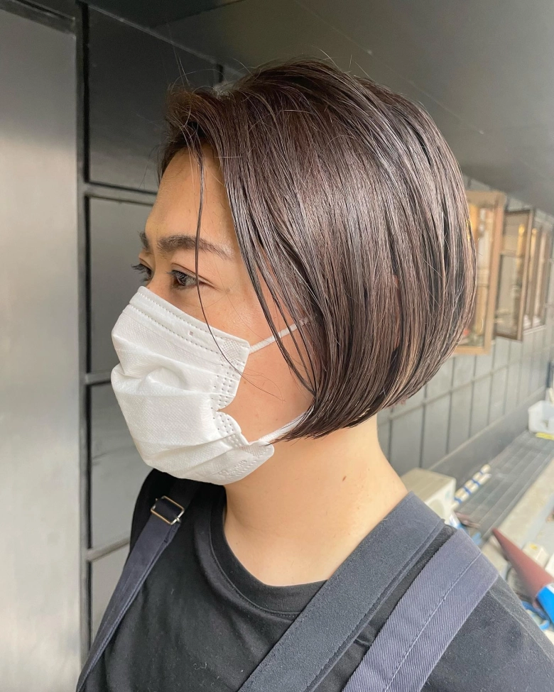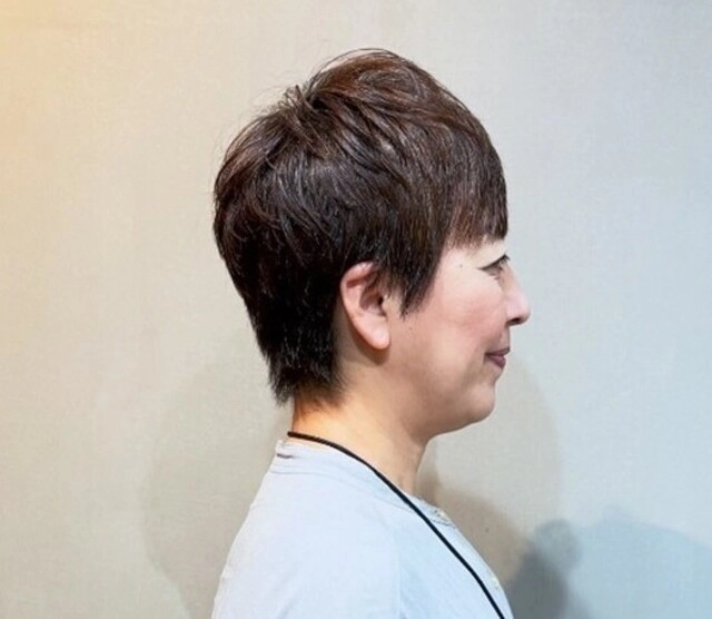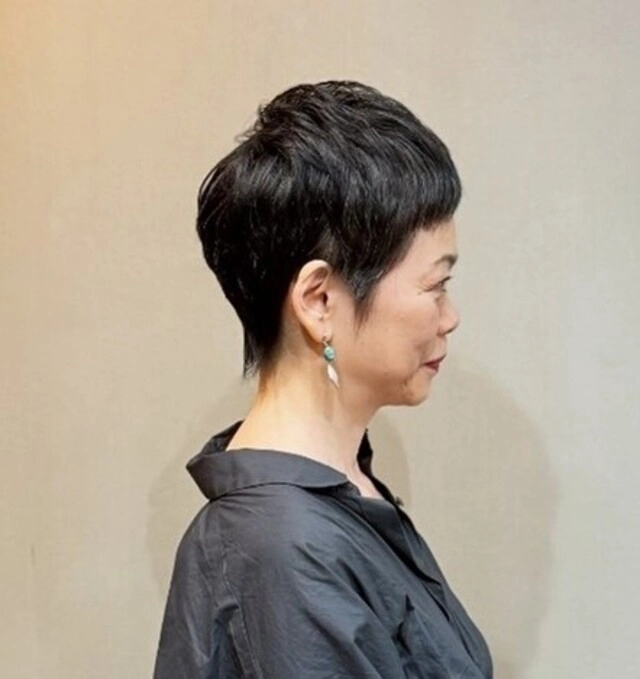 こちらは、サイドに耳かけできるほどの長さを残したショートスタイル。耳上にボリュームがでるようカットされているので、思いきって耳をだすことで緩急が際立ち、小顔効果を得られます。レイヤーを入れすぎないことで髪にツヤが生まれ、若々しさも演出できるでしょう。