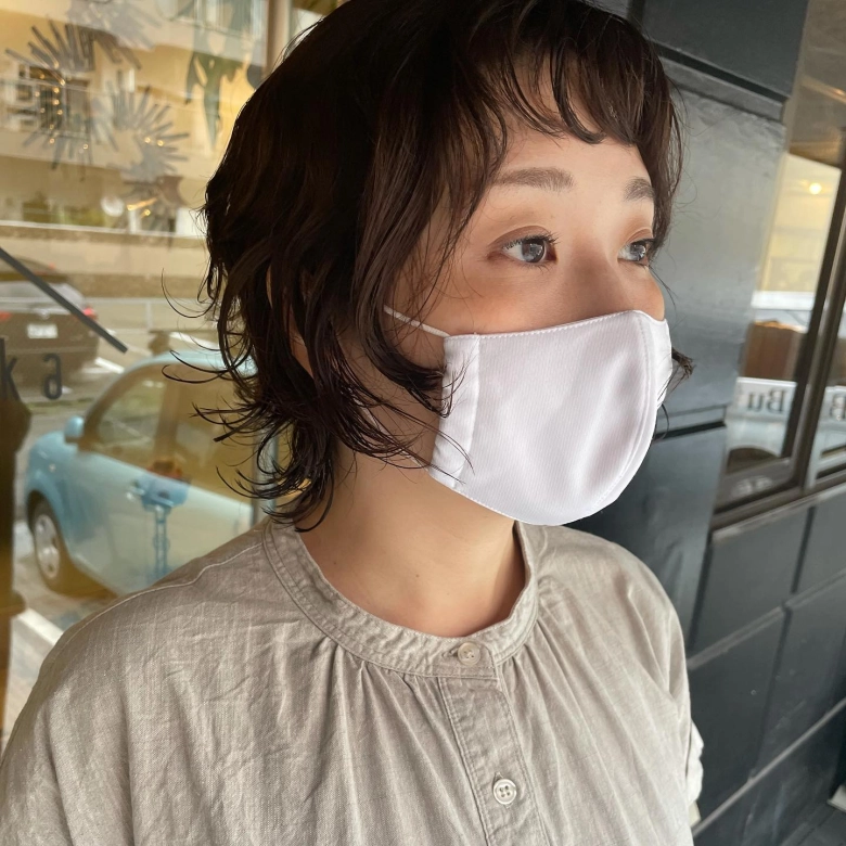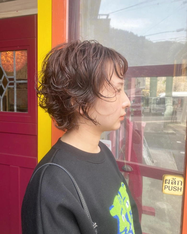 こちらは、くせ毛を活かしたパーマ風ショートウルフ。フェイスラインを沿うようにカットされており、ぽっちゃりさんや二重あごに悩む方にも似合う髪型です。乾かしてオイルでセットするだけでおしゃれに決まるので、毎日のお手入れも楽々♪