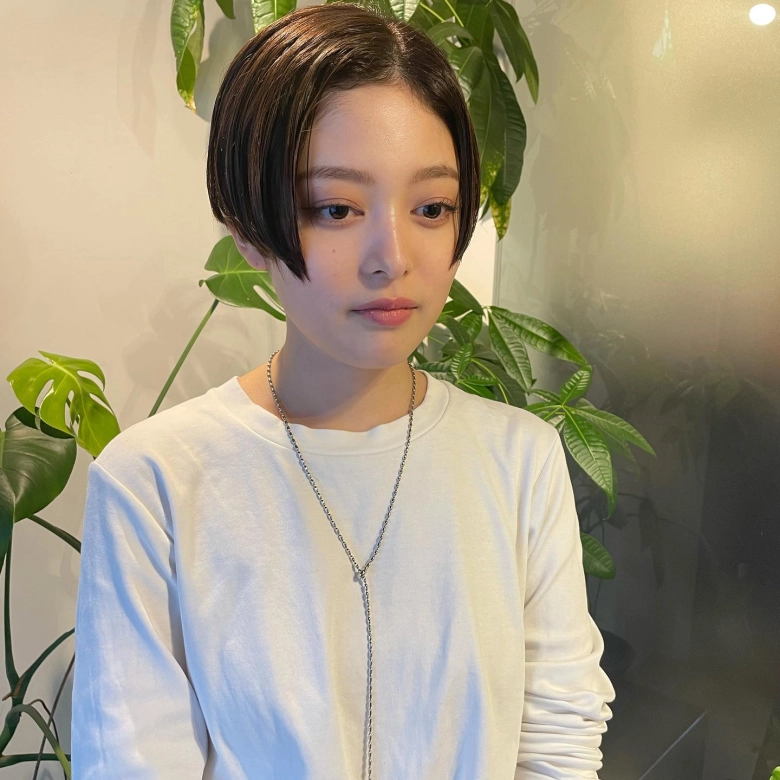 こちらは、長め前髪のハンサムショート。前髪とサイドバングがほぼ同じ長さでカットされており、流れるようなラインが魅力的です。長め前髪を分けることで縦のラインが生まれ、顔の横幅もカバー。襟足がきゅっと細くなっていることで、メリハリのあるスタイルに仕上がっています。