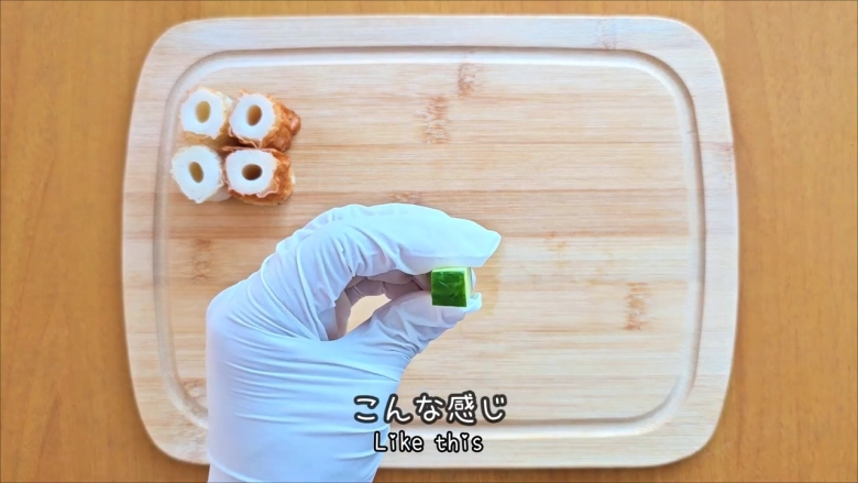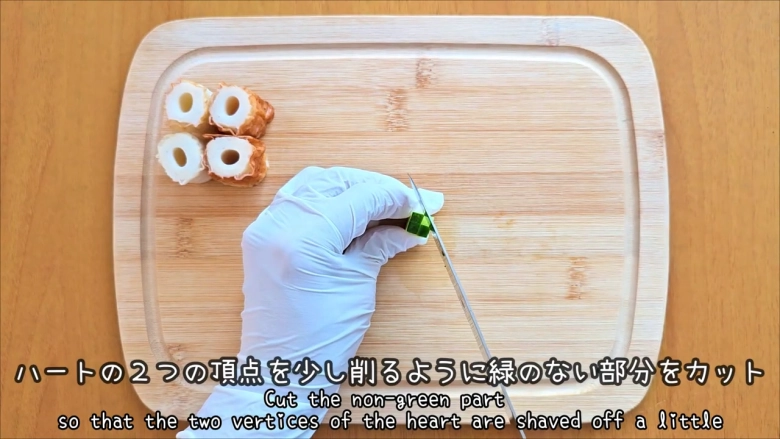 カットしておいたちくわの穴に、ハート型にしたキュウリを詰めます。