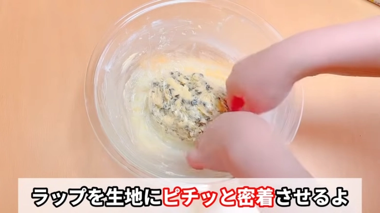 まとめた生地自体に、ラップがしっかり密着するように包みます。