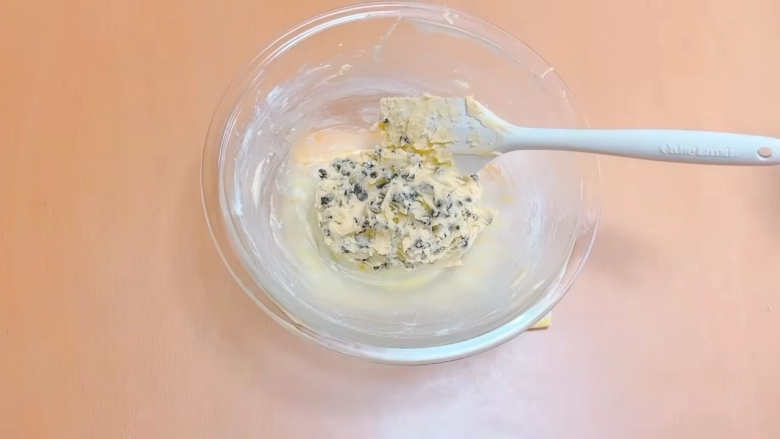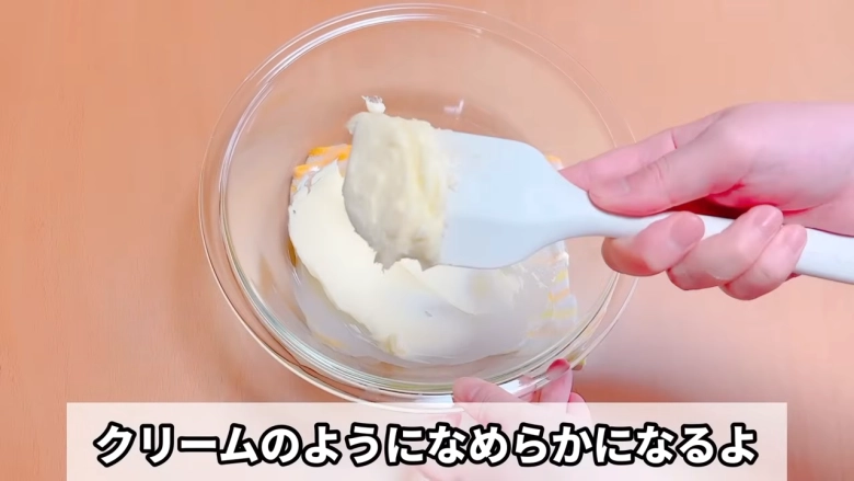 温まったバターをゴムベラで押しつけるようにして混ぜ、クリーム状にします。